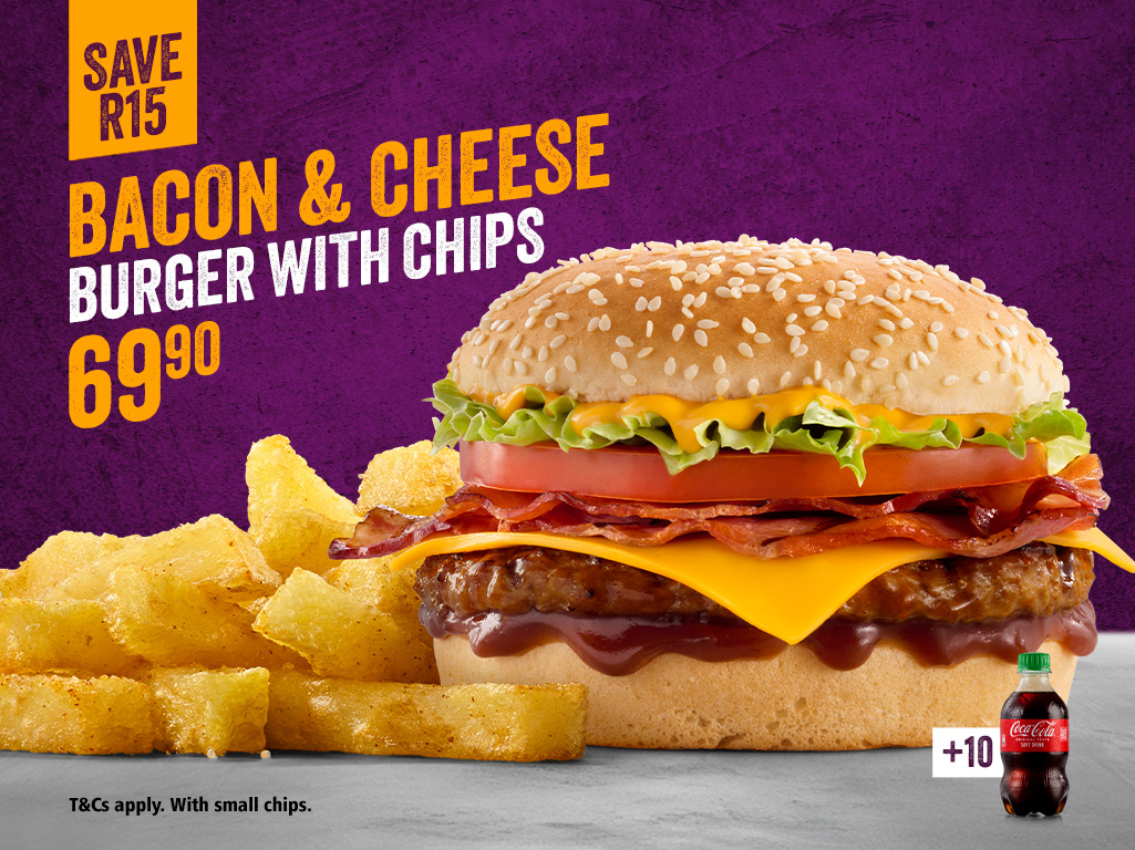 Cheese slice, double cheese sauce, bacon slice, mayo, mustard with chips & drink
